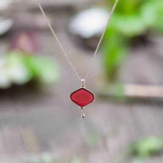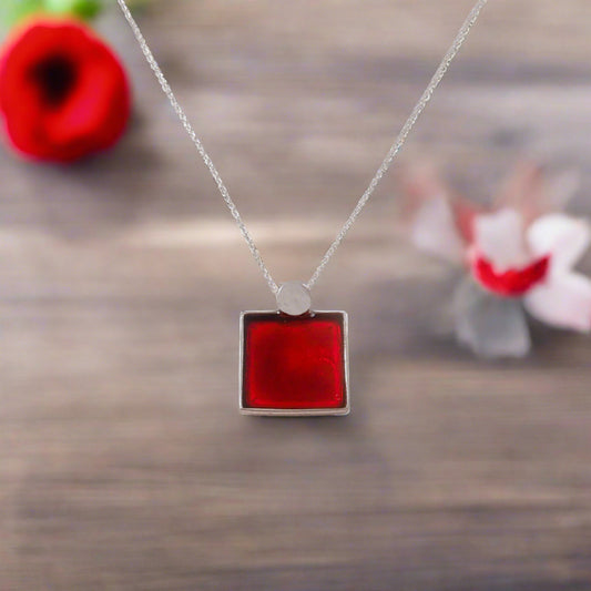 Μενταγιόν τετράγωνο από ασήμι με κόκκινο σμάλτο.