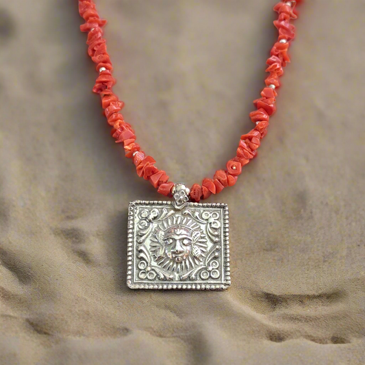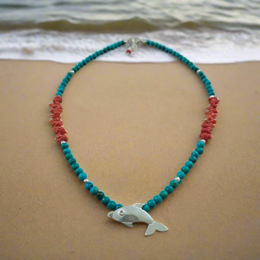 Handmade necklace with a sterling silver dolphin, turqoise and corals